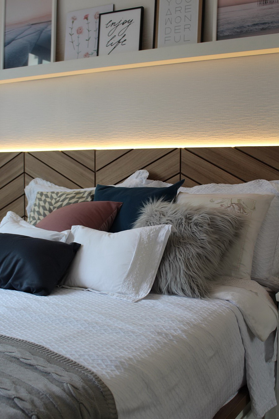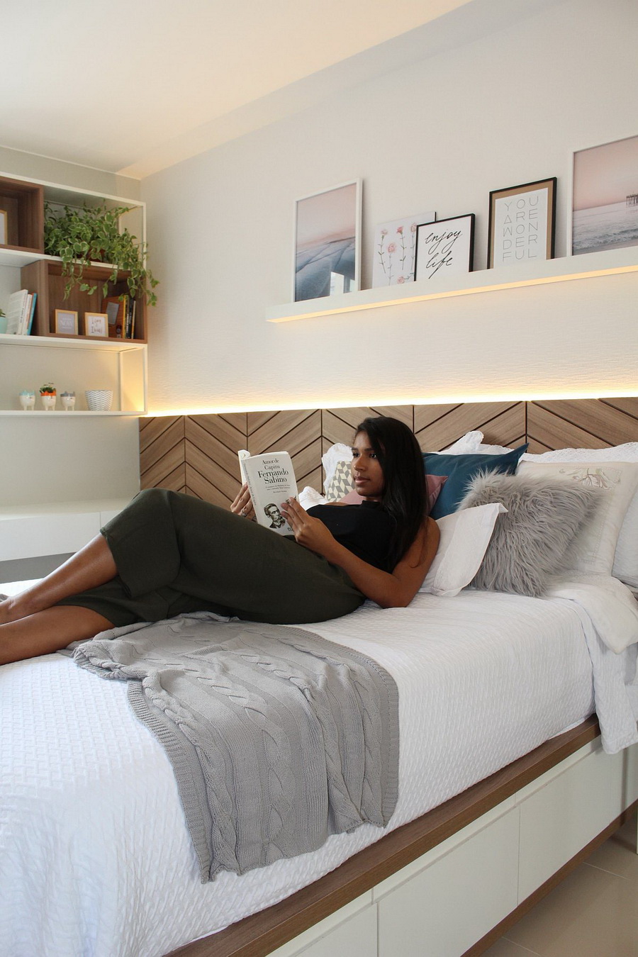 นอกจากนี้ยังมีการออกแบบที่เก็บรองเท้าไว้ใต้เตียง ซึ่งช่วยประหยัดพื้นที่ได้มาก พร้อมกับการเลือกใช้หลอดไฟแบบ LED ในห้อง ทำให้ห้องสว่างและโดดเด่น