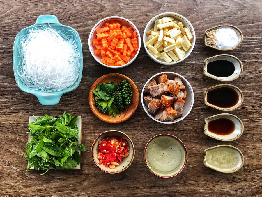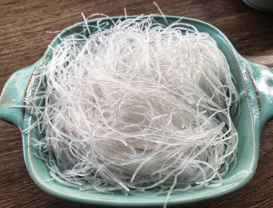1. วุ้นเส้นแช่น้ำ 80 กรัม ชั่งก่อนแช่นะคะ หรือประมาณ 1 ห่อ ป้าใช้ของต้นสนห่อนึงพอดี
