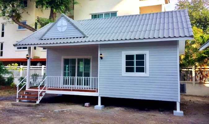 ลักษณะบ้านชั้นเดียวโครงสร้างเหล็ก หลังคาทรงหน้าจั่ว ทาสีขาวทั้งหลัง ดูเย็นและสบายตา เป็นอย่างยิ่ง ด้านหน้าเฉลียงทางเข้าบ้านมีการตกแต่งพื้นสีส้มอิฐ ตัดกันกับตัวบ้านสวยงาม ประตูทางเข้า และหน้าต่างใช้ประตูกระจกเพื่อการถ่ายเทอากาศได้สะดวก
