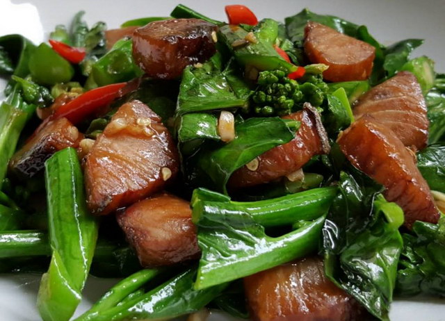 3. ใส่กระเทียมสับลงไป ตามด้วยคะน้า,พริกบุบ,ปลาเค