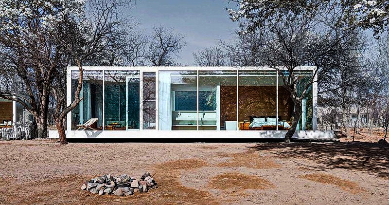 บ้านแต่ละหลังติดตั้งผนังกระจกถึง 3 ด้าน ใช้เหล็กเป็นโครงสร้าง ถูกออกแบบมาในรูปทรงกล่องโทนสีขาว