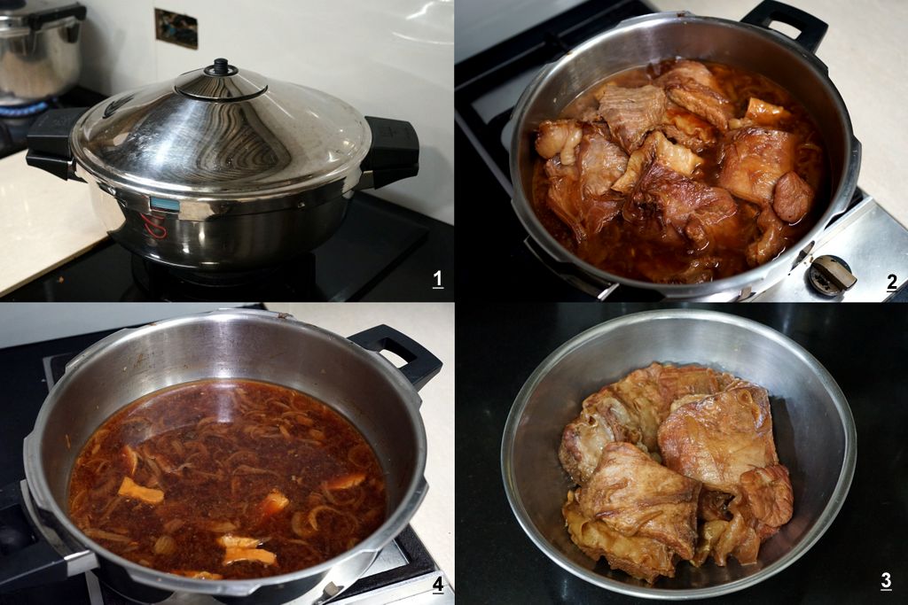 3. ต้มด้วยหม้อความดัน 40 นาที เนื้อสุกนิ่มตักเนื้อขึ้น