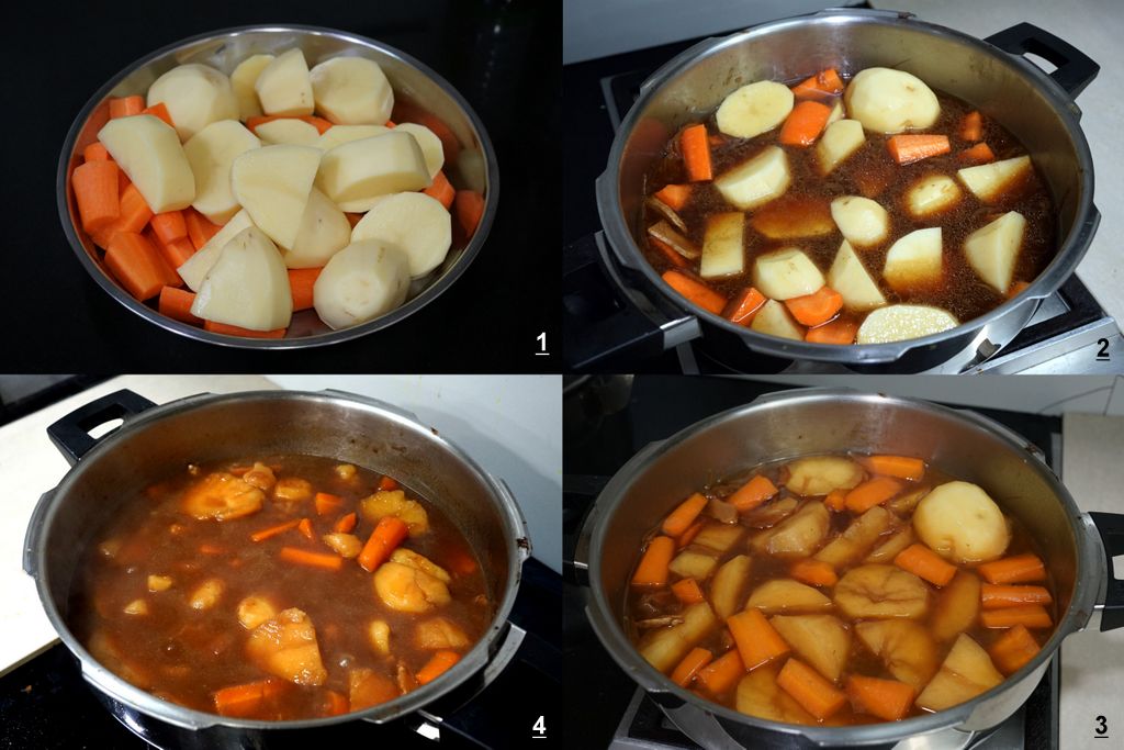 4. เอาแครอทและมันฝรั่งใส่ไปในหม้อ ต้มไปประมาณ 15 นาที จนแครอทและมันฝรั่งนิ่ม จากนั้นใส่แป้งมันฮ่องกงให้น้ำสตูข้น