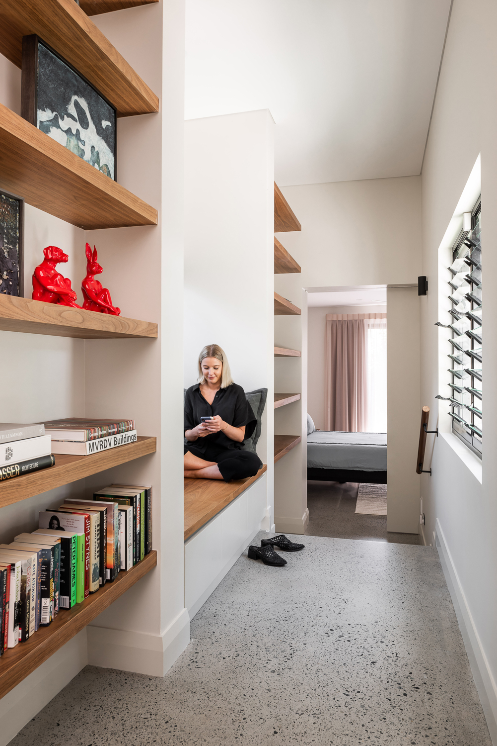 โถงทางเดินที่เชื่อมต่อไปยังห้องนอนถูกออกแบบให้เป็นชั้นวาง พร้อมกับมีมุมให้นั่งเล่น จึงกลายเป็นมุมสำหรับนั่งอ่านหนังสือได้อย่างเพลิดเพลินนั่นเอง