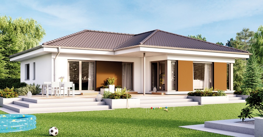 แบบบ้านชั้นเดียวยกพื้นสไตล์คอนเทมโพรารี ดีไซน์อบอุ่นน่าอยู่ ฟังก์ชันทันสมัย 4 ห้องนอน 2 ห้องน้ำ พื้นที่ 97 ตร.ม.