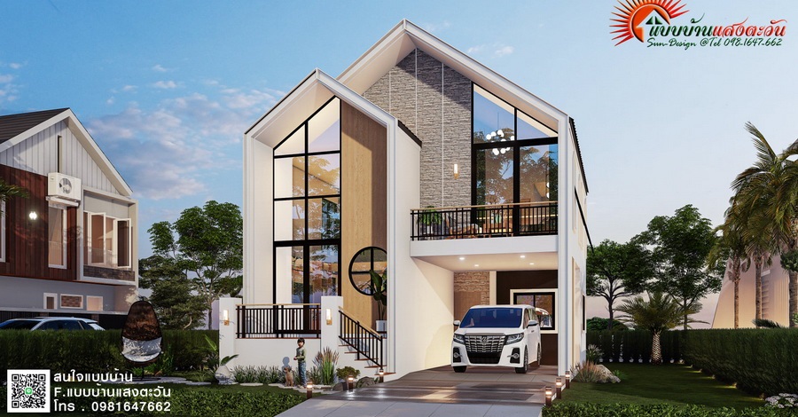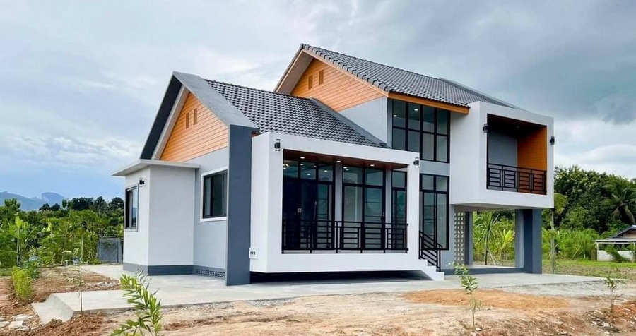 บ้านสองชั้นสไตล์โมเดิร์น ออกแบบใต้ถุนยกสูง หลังคาทรงหน้าจั่วเล่นระดับ 3 ห้องนอน 2 ห้องน้ำ