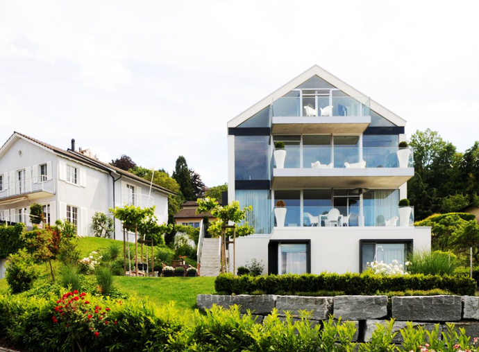 Read Moreแบบบ้านสไตล์โมเดิร์นสีขาว โดดเด่นด้วยหลังคาหน้าจั่วใหญ่ และผนังกระจกใสทุกชั้น