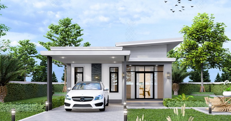 แบบบ้านหน้ากว้างชั้นเดียวสไตล์โมเดิร์น ออกแบบเน้นความเรียบง่าย 3 ห้องนอน 2 ห้องน้ำ พื้นที่ 100 ตร.ม.