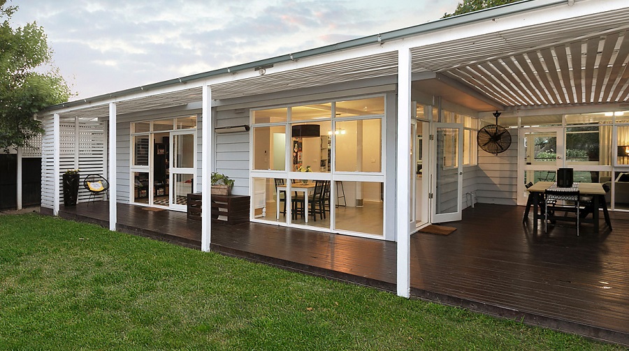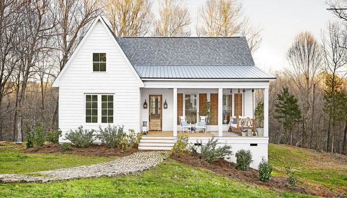 บ้านชั้นเดียวสไตล์คอจเทจ โดดเด่นด้วยผนังและระแนงไม้สีขาว พร้อมพื้นที่พักผ่อนเฉลียงติดสวน