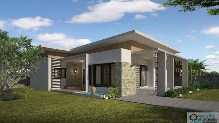 Read Moreแบบบ้านชั้นเดียวสไตล์โมเดิร์น โทนสีสบายตา หลังคาเพิงหมาแหงน พร้อมด้วยระเบียงเพื่อการพักผ่อน