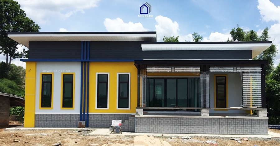 บ้านโมเดิร์นชั้นเดียว ดีไซน์หลังคาเล่นระดับ โดดเด่นด้วยผนังภายนอกโทนสีสดใส 3 ห้องนอน 2 ห้องน้ำ พร้อมบรรยากาศภายในโปร่งสบาย