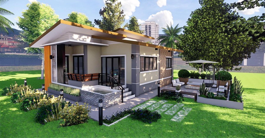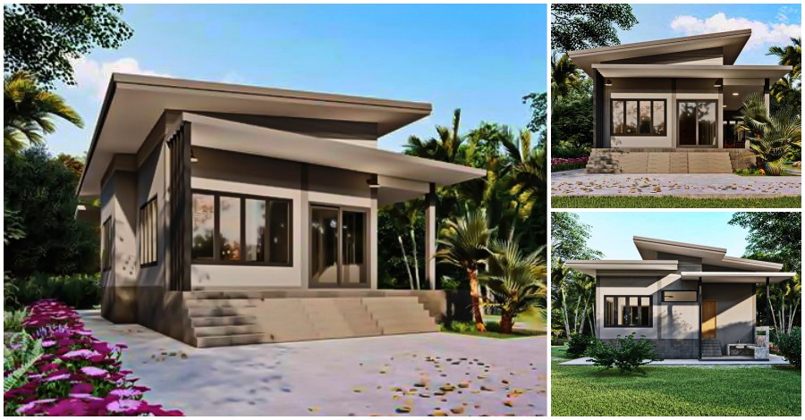 บ้านชั้นเดียวหลังเล็ก สไตล์โมเดิร์น หลังคาทรงปีกนก 2 ห้องนอน 1 ห้องน้ำ พร้อมเฉลียงหน้าบ้าน