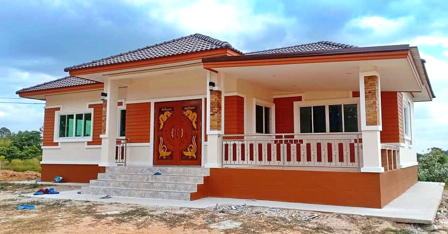 บ้านชั้นเดียวยกพื้นสไตล์ร่วมสมัย โทนสีน้ำตาลอบอุ่น 3 ห้องนอน 2 ห้องน้ำ พร้อมเฉลียงพักผ่อนรับลม