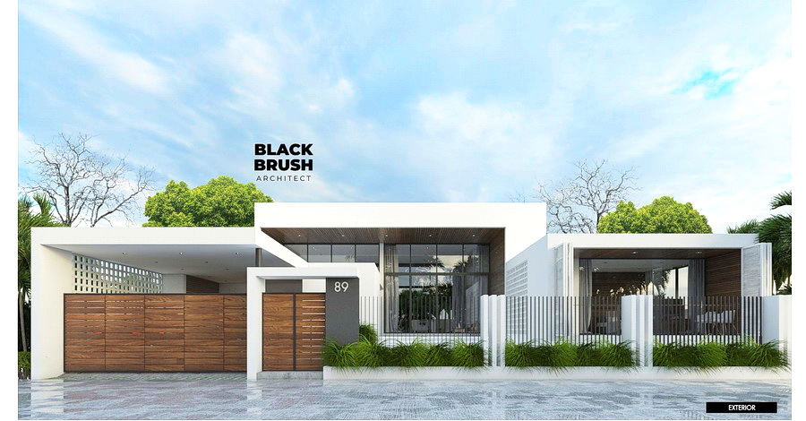 แบบบ้านหน้ากว้างสไตล์โมเดิร์น เน้นการตกแต่งในโทนขาว-ดำ 2 ห้องนอน 1 ห้องน้ำ พื้นที่ 108 ตร.ม.