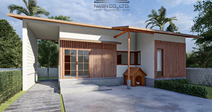Read Moreแบบบ้านชั้นเดียวโมเดิร์นทรงจั่ว ตกแต่งด้วยไม้ กระจก ปูนเปลือย สำหรับที่ดินหน้าแคบ 2 ห้องนอน 1 ห้องน้ำ พื้นที่ใช้สอย 65 ตร.ม.