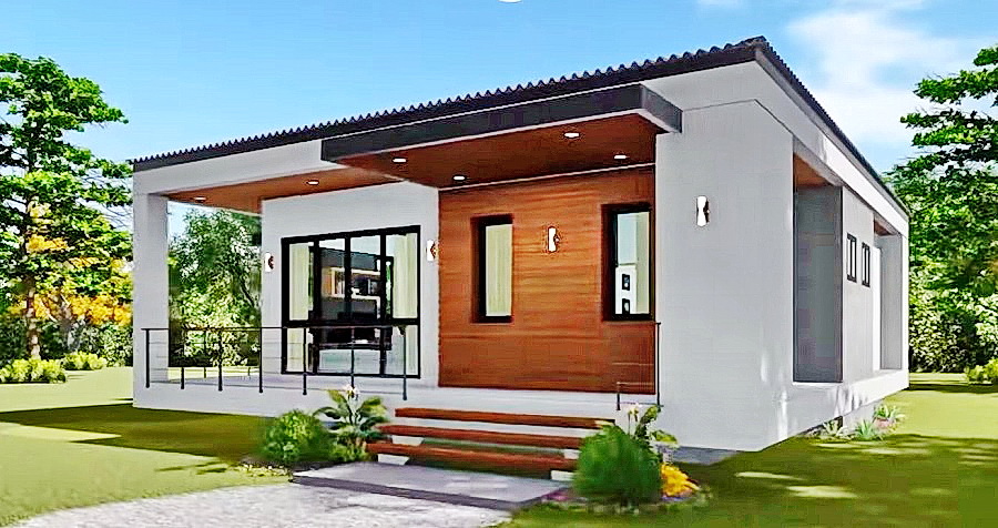 แบบบ้านโมเดิร์นชั้นเดียว โทนสีขาว-น้ำเงิน ดีไซน์เรียบง่ายกะทัดรัด พร้อมระเบียงพักผ่อนกว้างขวาง