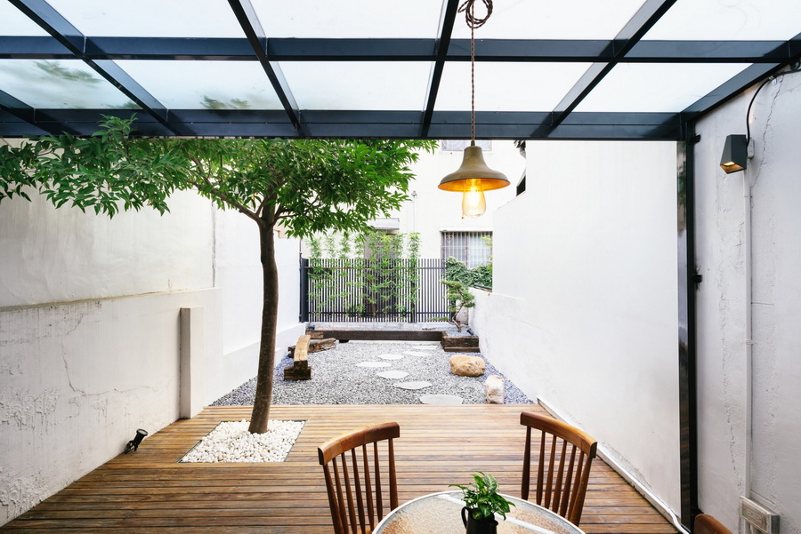เฉลียงไม้หลังบ้าน มุงด้วยหลังคาโปร่งแสง เชื่อมต่อกับสวนหินโดยตรง