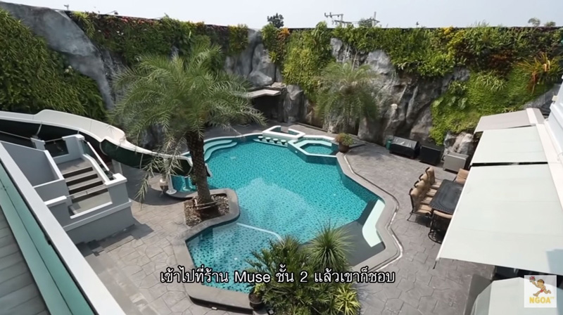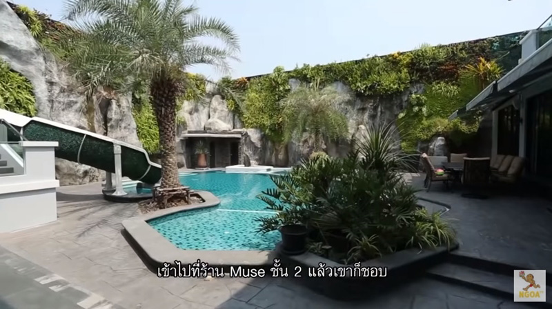 สิ่งที่น่าสนใจอีกอย่างของบ้านหลังนี้คือสระว่ายน้ำขนาดใหญ่ ที่ให้อารมณ์เหมือนกับว่ายน้ำกลางธรรมชาติ เพราะรายล้อมไปด้วยวิวภูเขาและหน้าผา มาพร้อมสไลด์เดอร์ที่ตั้งใจเอาไว้ให้ลูกของคุณธัญญ่าเล่นนั่นเองครับ