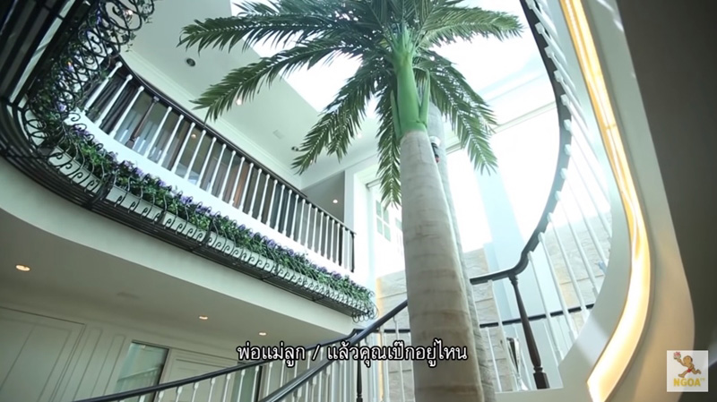 อีกมุมหนึ่งที่ดูเก๋สุด ๆ ก็คือบันได เป็นบันไดทรงวนที่สวยหรู เข้ากับภาพรวมการตกแต่งของตัวบ้าน นอกจากนี้ยังมีต้นมะพร้าวขนาดใหญ่อยู่ตรงกลาง รายล้อมไปด้วยดอกไม้ริมระเบียง
