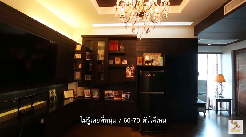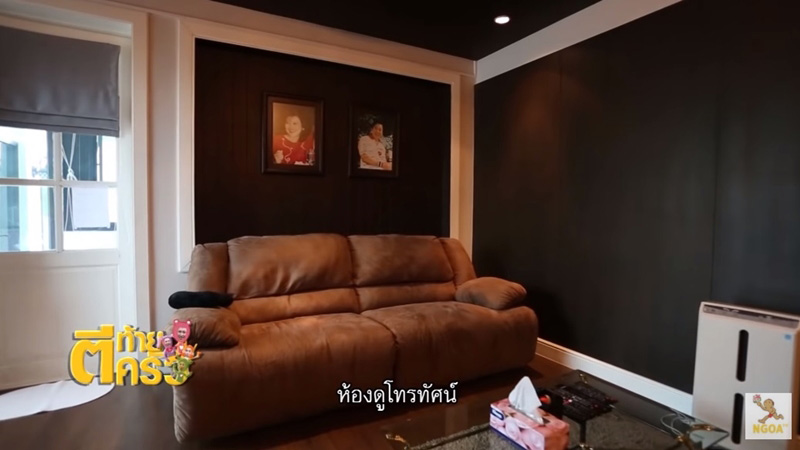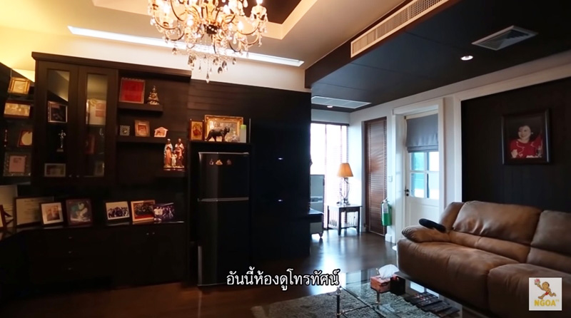 ส่วนห้องนี้คือห้องดูทีวี ตกแต่งโดยเน้นความทีบด้วยโทนสีน้ำตาล เพิ่มความสว่างด้วยโคมไฟแชนเดอเลียร์ดีไซน์สุดหรูกลางห้อง