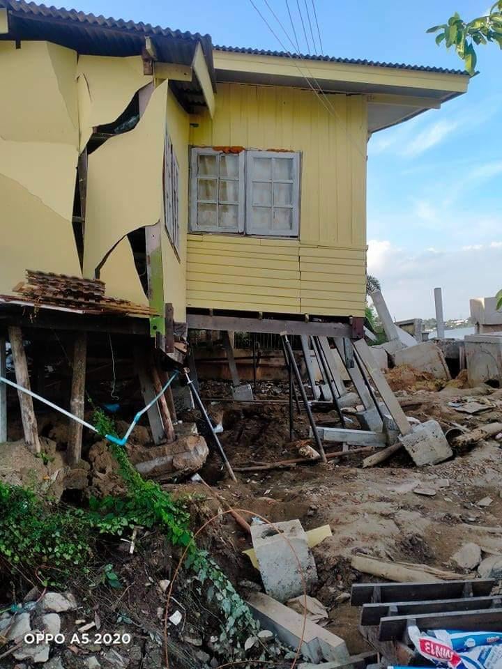 จนฝาบ้านเริ่มอ้าออก จึงแจ้งเรื่องไปทางโยธาอีกครั้ง โยธาก็ลงมาดูและทำการเซฟบ้าน ซึ่งในสายตามองเป็นการเซฟที่หลวมมาก แต่ก็ไม่คิดว่าดินจะไหลไปขนาดนั้น สรุปว่า เขื่อนไหลลงแม่น้ำ ดึงบ้านจนเอนเฉียงเทลง