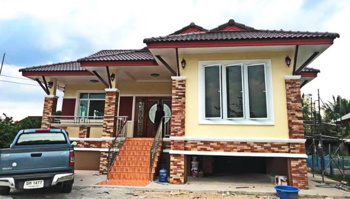 บ้านหลังนี้เป็นผลงานบ้านสวยๆ จากคุณ พรสวรรค์ คำยางจ้อง ดีไซน์บ้านชั้นเดียวยกพื้นสูง กรุช่องสำหรับเก็บของไว้บริเวณฐานบ้าน โครงสร้างบ้านปูนแต่งแต้มด้วยโทนสีครีมอ่อน ผสมผสานกับเสากรุแต่งกระเบื้องหินเทียม มุงหลังคาทรงจั่วกึ่งปั้นหยา ให้รูปลักษณ์ที่สวยงามตามแบบฉลับบบ้านไทยประยุกต์