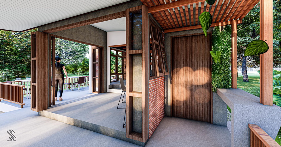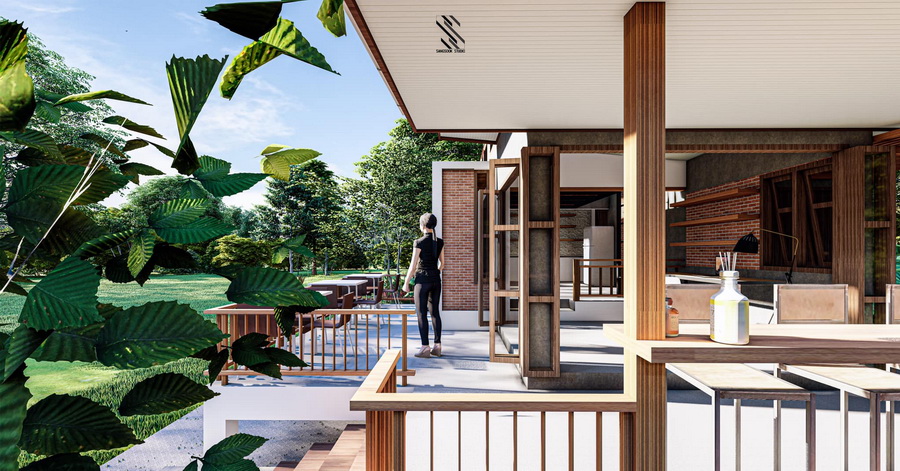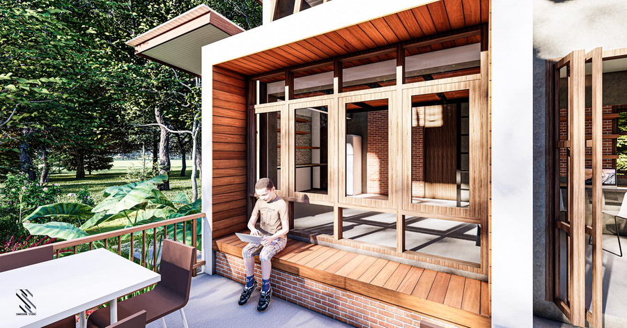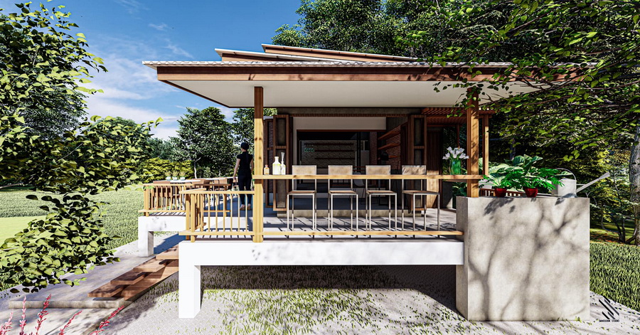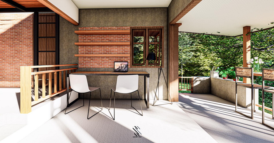 ขยับเข้ามาจากตัวบาร์ ก็จะมีพื้นที่โต๊ะทำงาน ซึ่งตั้งอยู่ด้านนอกตัวบ้าน จึงเหมาะกับการสร้างบ้านหลังนี้ไว้ในสวนสงบ ๆ เพื่อที่จะได้ทำงานในบรรยากาศที่สดชื่นได้