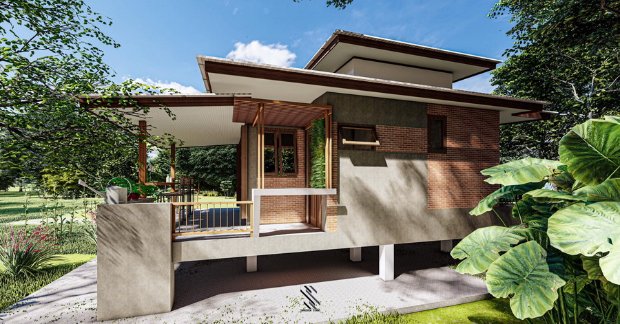 แบบบ้านหลังนี้เป็นบ้านชั้นเดียว ฐานของบ้านถูกออกแบบยกขึ้นสูง ดีไซน์หลักของบ้านให้ลักษณะที่เรียบง่ายในทรงเรขาคณิตแบบโมเดิร์น ตัวหลังคาเป็นแบบเพิงหมาแหงน ความโดดเด่นของการตกแต่งอยู่ที่การตกแต่งด้วยผนังปูนเปลือย ผสานกับผนังอิฐโชว์แนวแบบสวยดิบ
