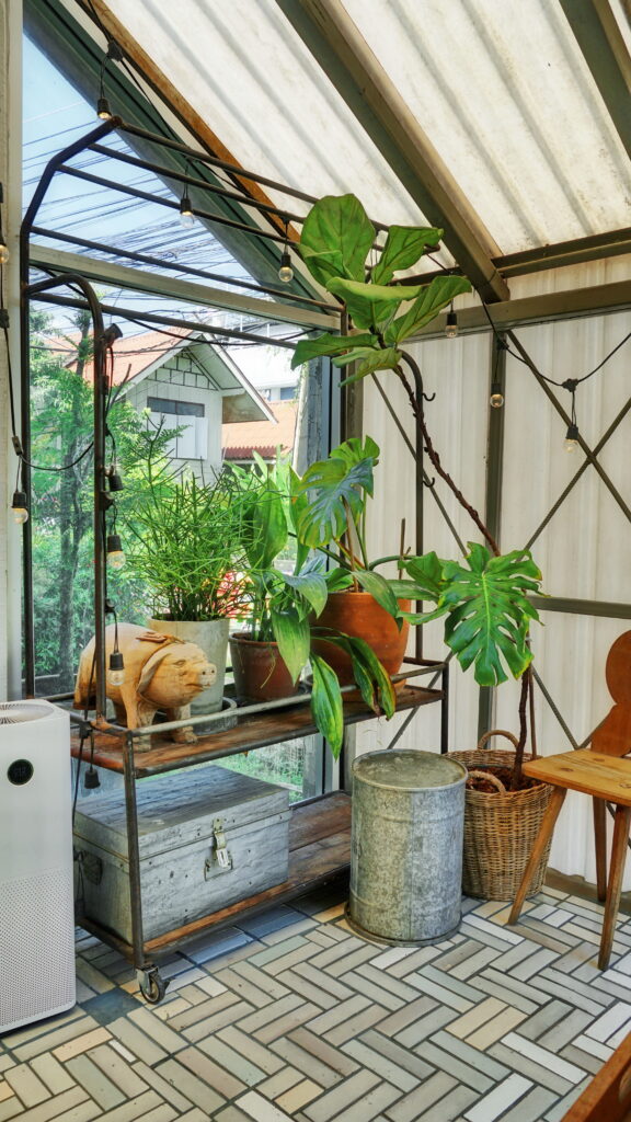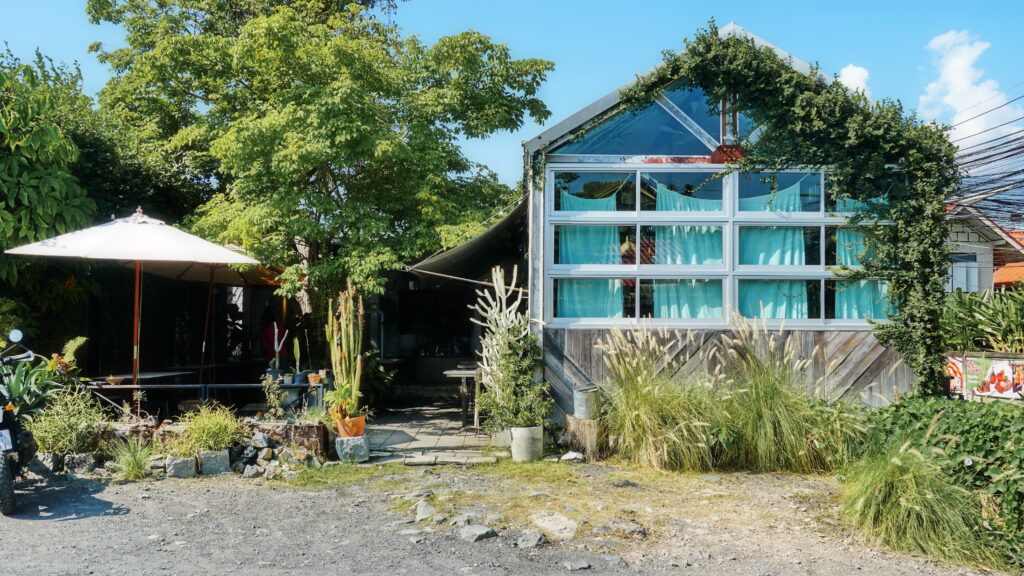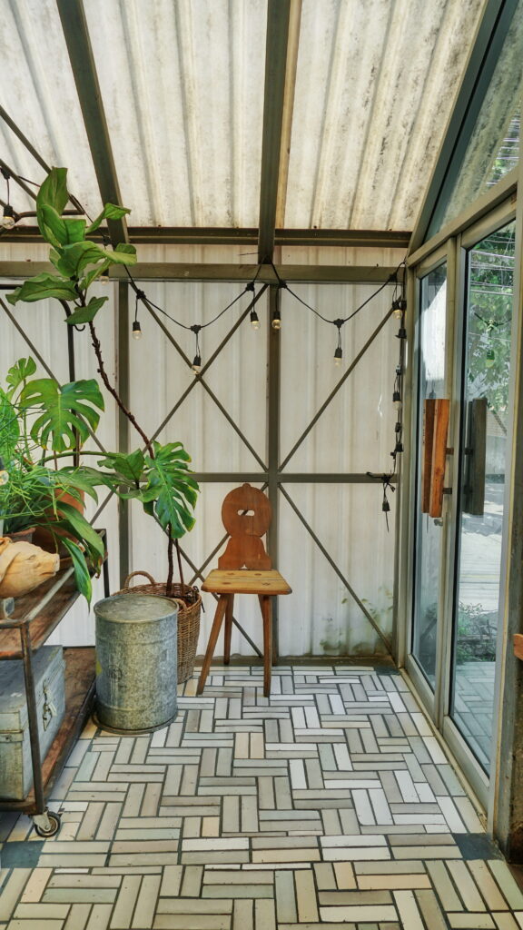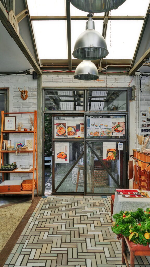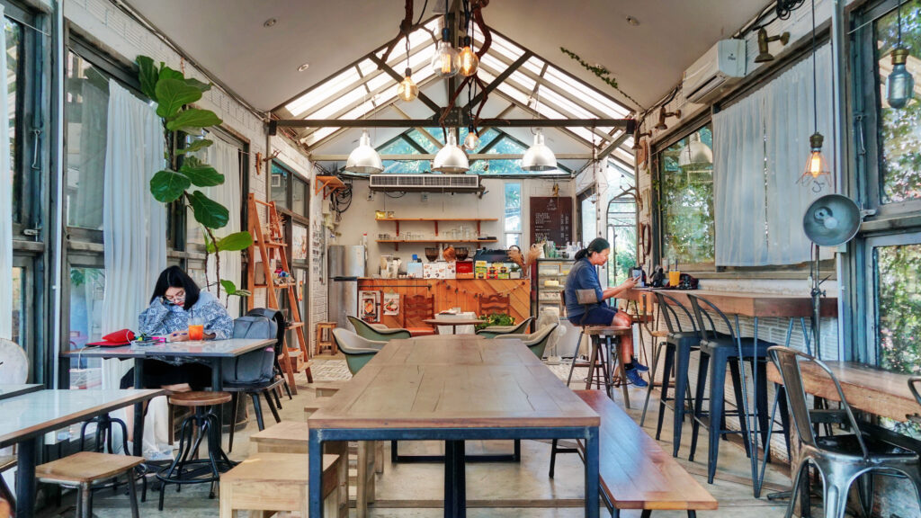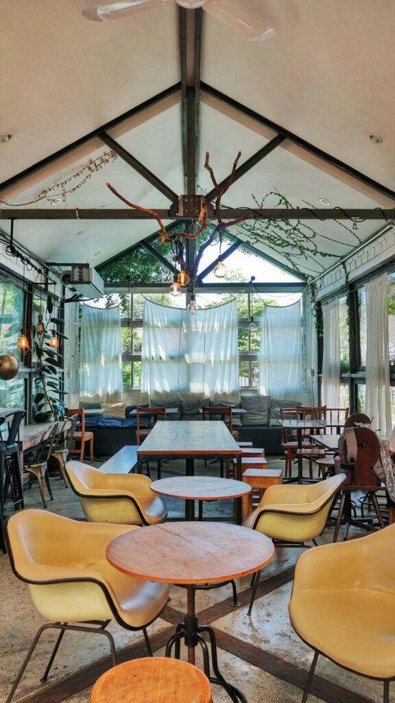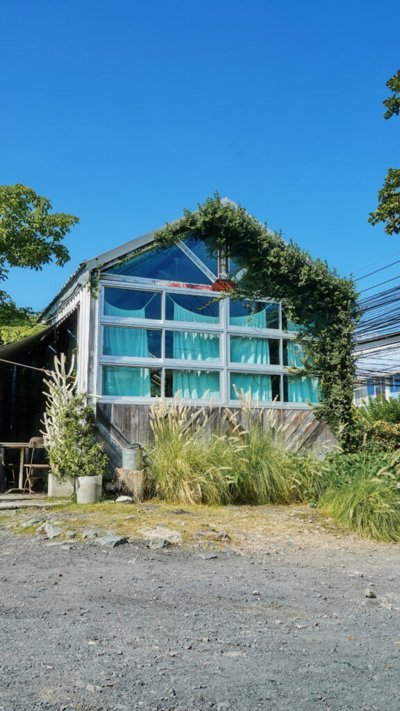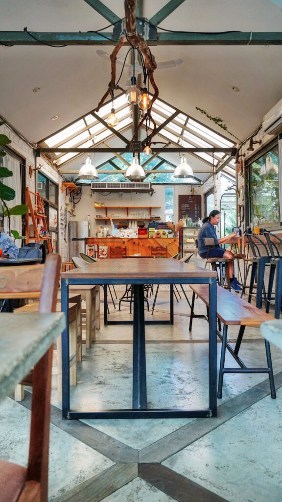 ตัวอาคารหลักของร้านที่เป็นแบบโรงนายุโรปที่ภายในมีพื้นที่โปร่งสบาย พร้อมกับเพดานที่ออกแบบยกสูง พร้อมผนังกระจกใสรอบด้านที่ให้แสงสว่างภายในบ้าน