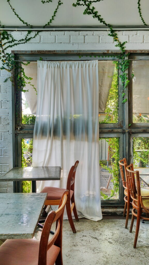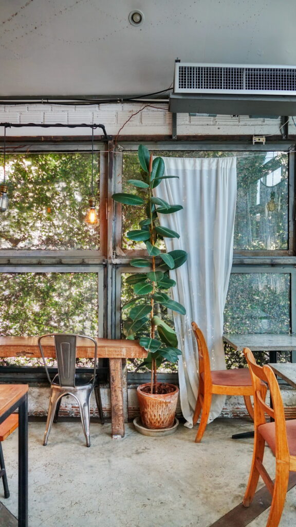 โครงสร้างเหล็กและปูนของอินดัสเทรียลให้บรรยากาศที่เคร่งขรึมดุดัน จึงถูกลดบรรยากาศแบบนั้นด้วยการตกแต่งด้วยต้นไม้สีเขียวสดชื่น
