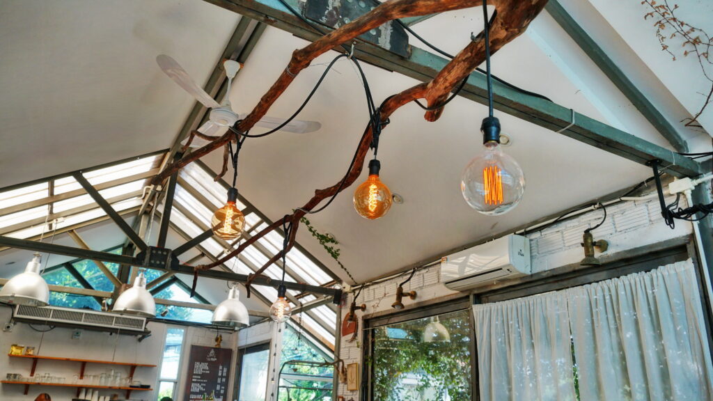โคมไฟสีส้มสไตล์อินดัสเทรียลที่ห้อยลงมาจากกิ่งไม้
