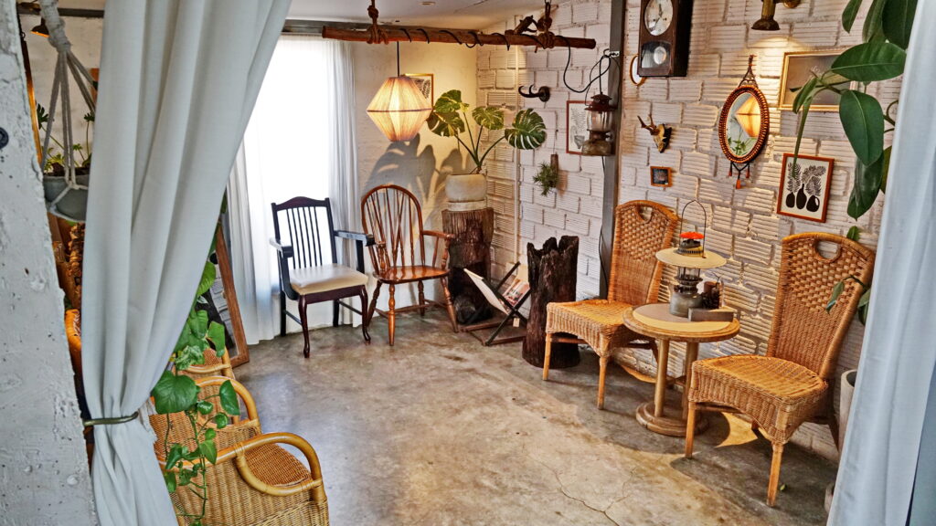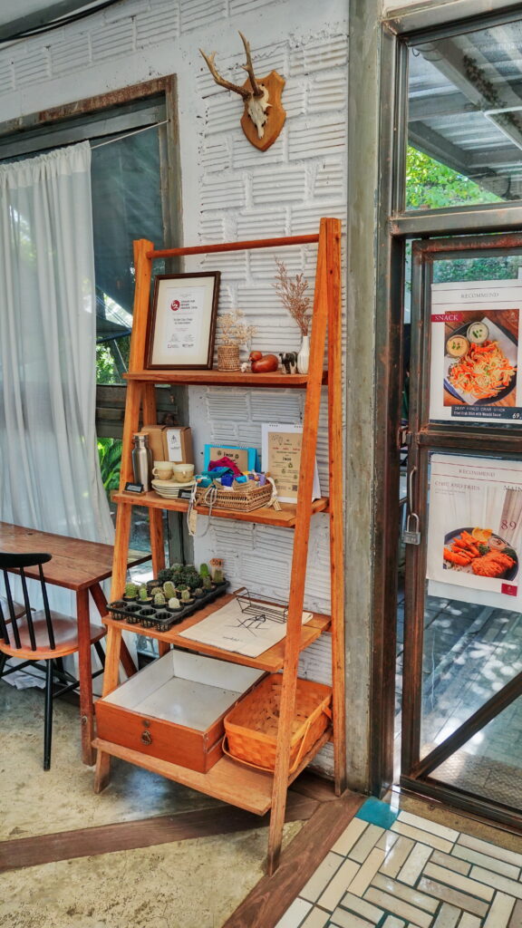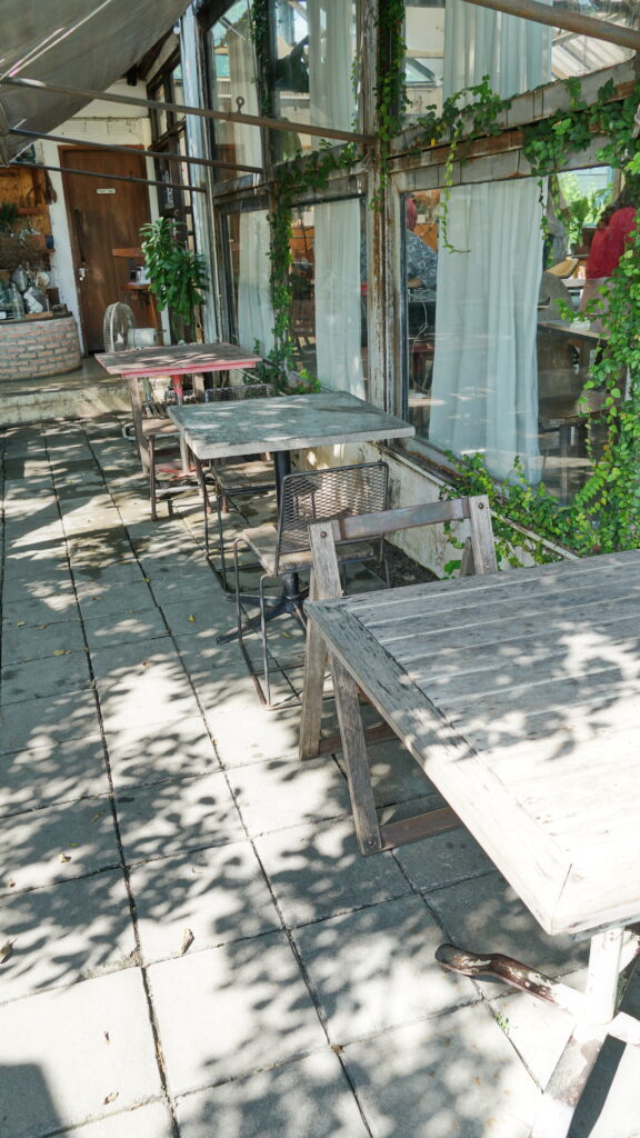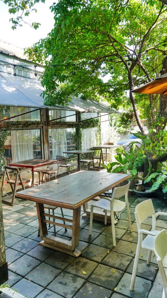 ด้านนอกอาคารมีพื้นที่เปิดโล่งที่มีต้นไม้หลายขนาดพื้นปกคลุมให้ร่มเงา มีโต๊ะไม้ถูกจัดวางกระจายทั่วทั้งบริเวณเพื่อให้ลูกค้าได้นั่งดื่มกาแฟกันอย่างสบายอารมณ์
