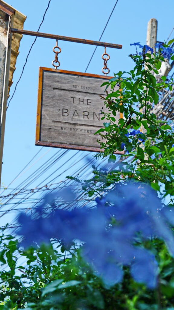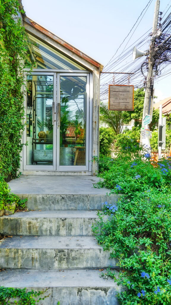 จากมุมนี้เราจะเห็นสรายละเอียดของอาคารของร้าน THE BARN ได้เต็ม ๆ อาคารโครงสร้างเหล็กและไม้แบบยาว มีผนังกระจกใส ถูกปกคลุมไปด้วยเถาไม้เลื้อยที่ให้ความเขียวขจีสดชื่น
