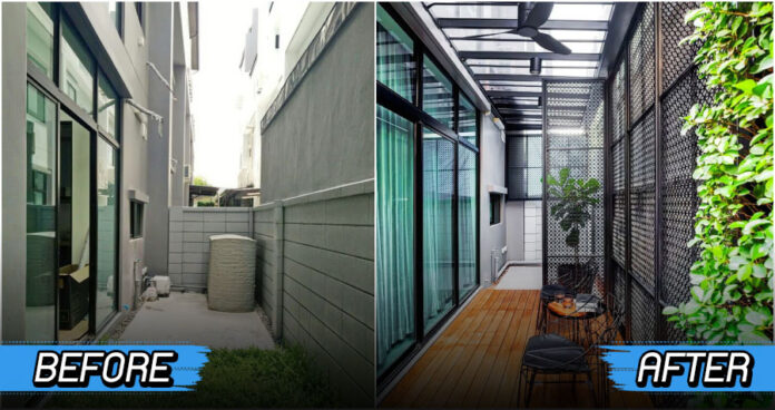จากเดิมที่เป็นเพียงหลังบ้านว่าง ๆ เอาไว้วางแทงค์น้ำ ปั๊มน้ำ และเตรียมเอาไว้วางเครื่องซักผ้า กลายมาเป็นมุมพักผ่อนสุดชิลด้วยการติดตั้งเทอเรซไม้หรือพื้นไม้ยกระดับ พร้อมด้วยโครงเหล็กสีดำ หน้าตาของมันจะเป็นอย่างไร ตามมาชมกันเลย!