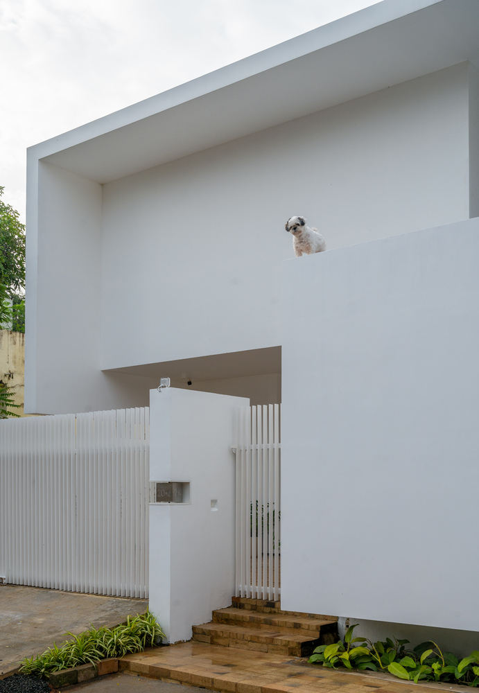 โดยบ้านหลังนี้ เป็นบ้านที่มีดีไซน์ทรงสี่เหลี่ยม จึงให้เส้นสายที่คมชัดและมีมิติที่สวยงามตามแบบฉบับบ้านแนวโมเดิร์น โดยจุดเด่นจะอยู่ที่การตกแต่งด้วยโทนสีขาวทั้งหลัง
