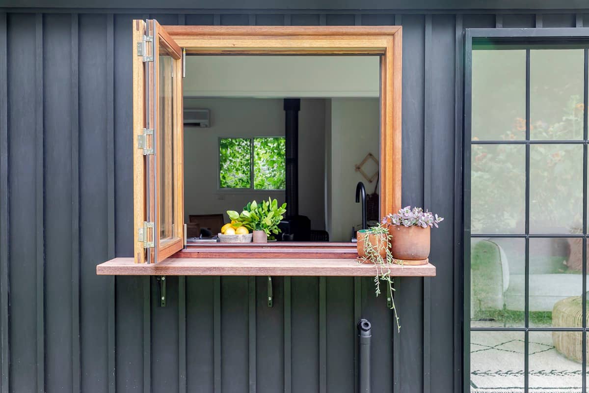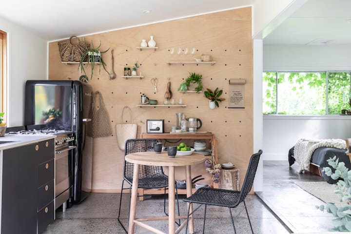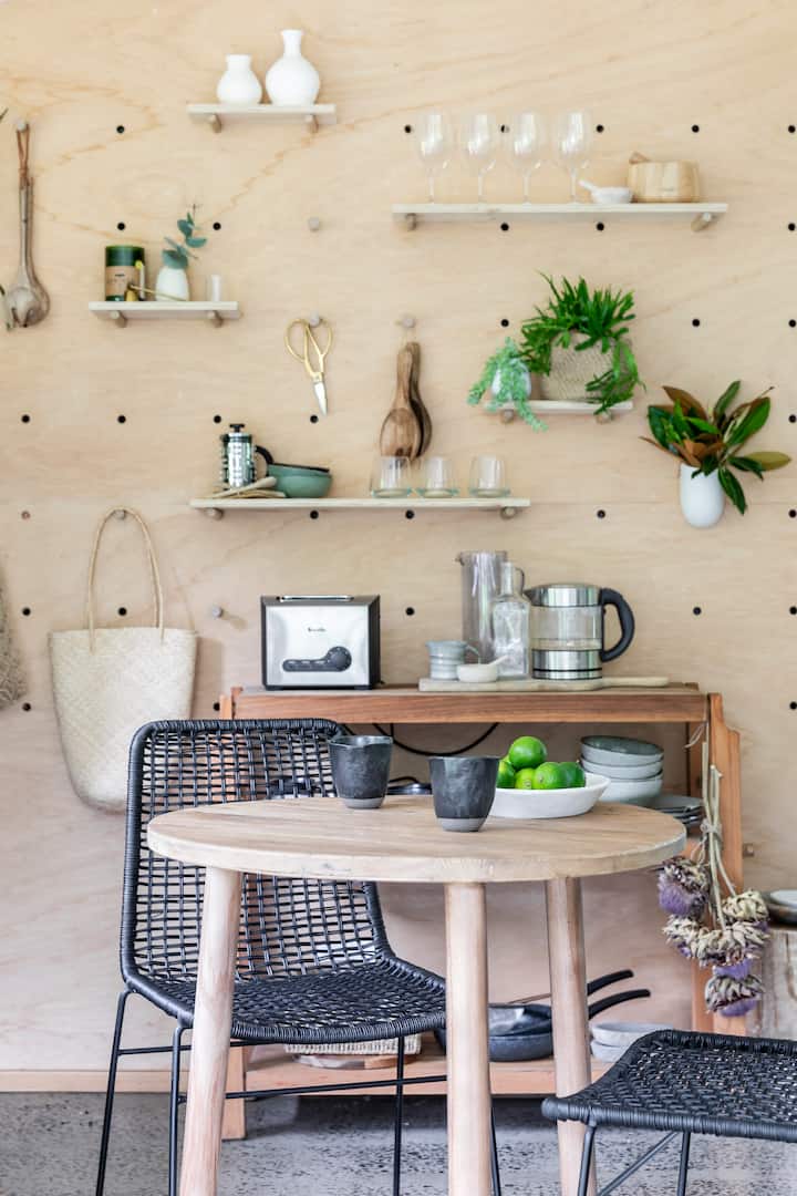 มุมของห้องครัวจะมีการตกแต่งอย่างพิเศษ เพราะนอกจากส่วนของเคาน์เตอร์ครัวแล้ว ที่ผนังยังเป็นแบบไม้อัดที่สามารถปรับและติดตั้งแผ่นไม้ให้เป็นชั้นวางได้หลายรูปแบบ