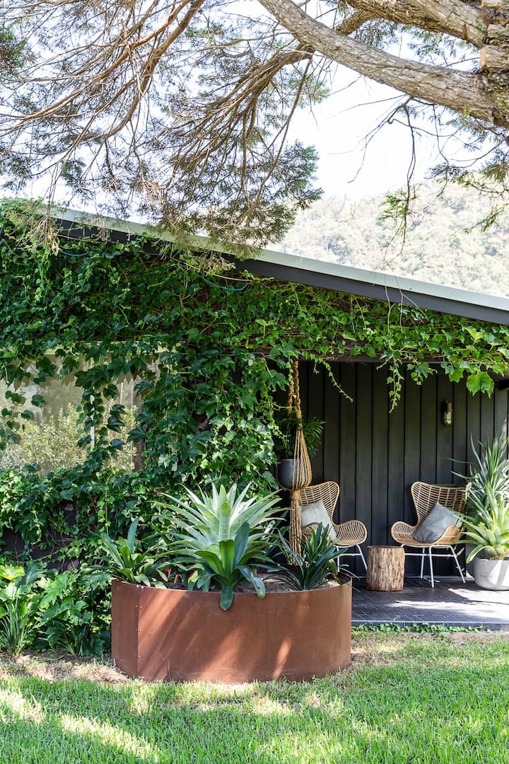 ภายนอกบ้านมีเฉลียงเล็ก ๆ ที่เจ้าของบ้านจัดมุมเล็ก ๆ เอาไว้นั่งเล่น ทั่วบริเวณถูกตกแต่งไปด้วยต้นไม้ขนาดต่าง ๆ โดยเฉพาะที่เลื้อยไปตามพื้นที่หลังคา