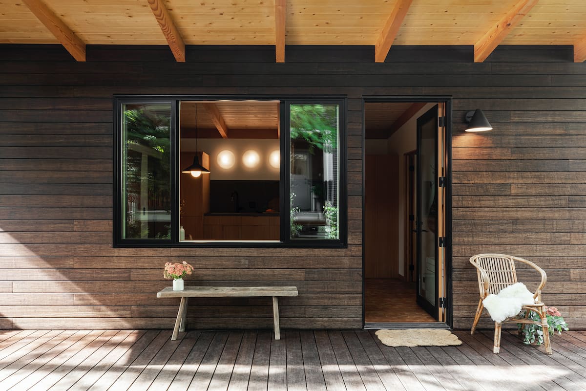 บริเวณหน้าบ้านมีพื้นที่เฉลียงไม้กว้าง ๆ ที่สามารถจัดไว้เป็นมุมนั่งเล่น พักผ่อน หรือจะนั่งทำกิจกรรมเล็ก ๆ น้อย ๆ แบบใกล้ชิดกับธรรมชาติก็ได้