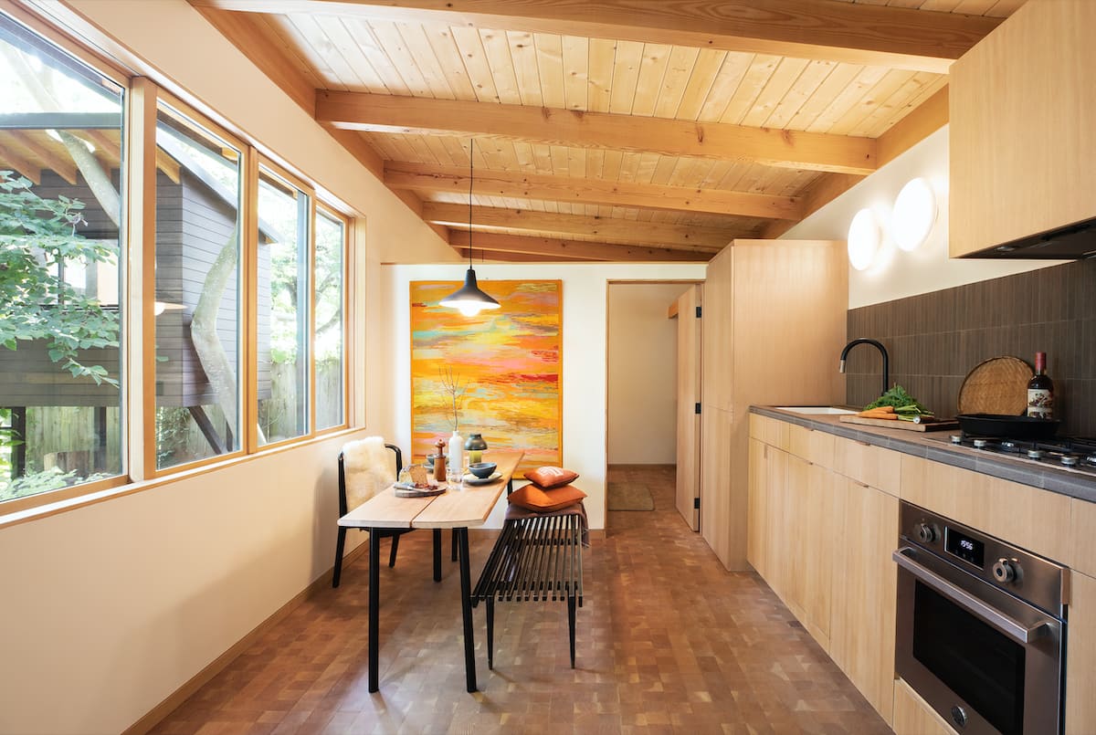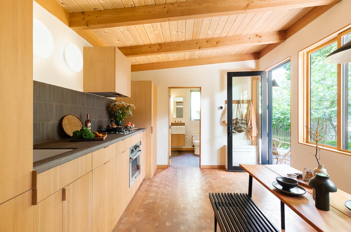 ส่วนนี้เป็นห้องครัวที่ตกแต่งด้วยงานไม้ทั้งหมด จึงให้โทนสีที่อบอุ่นและเป็นธรรมชาติ ขณะที่สิ่งอำนวยความสะดวกต่าง ๆ ก็สามารถใช้งานได้ดี