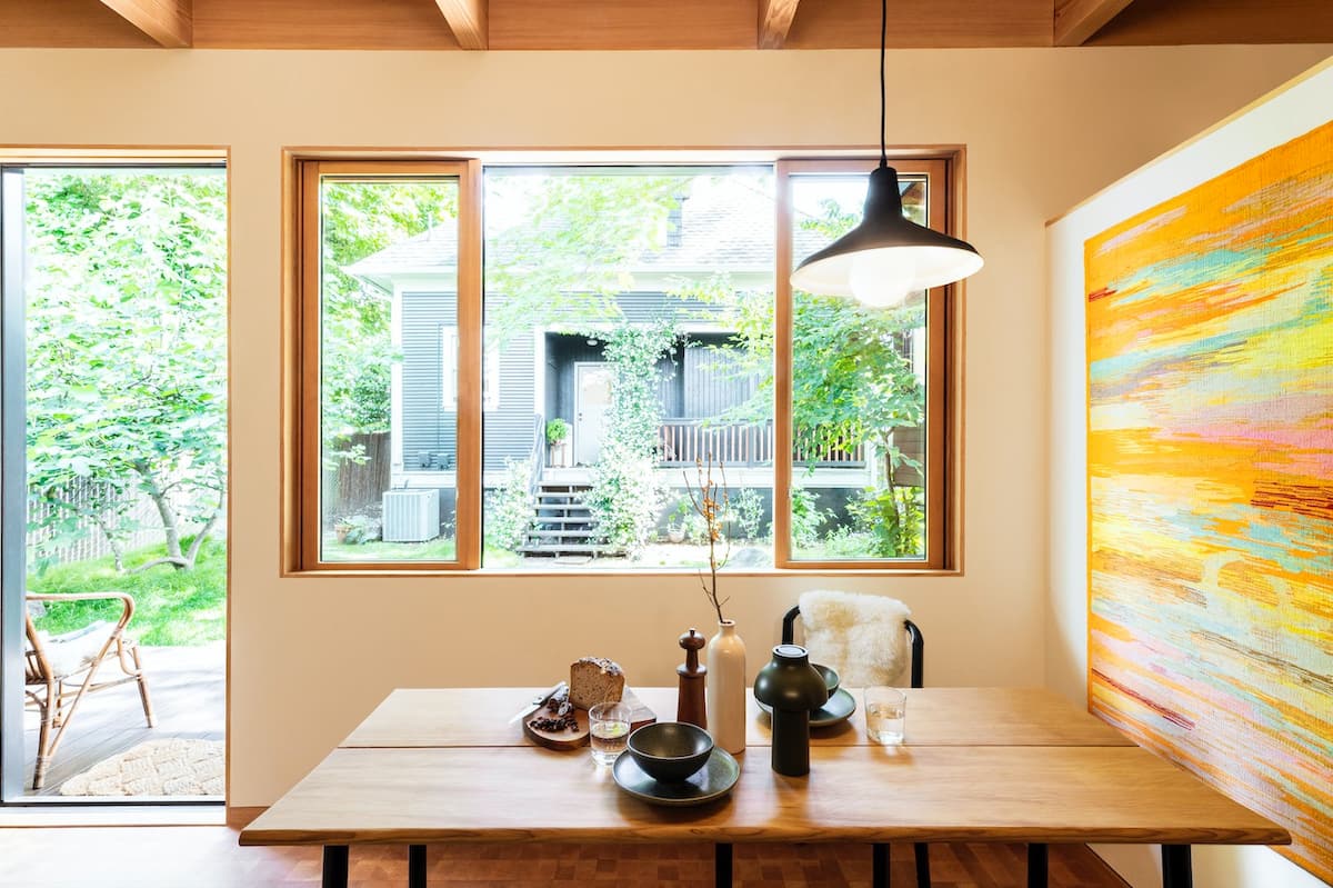 มุมโต๊ะรับประทานอาหารเป็นโต๊ะไม้ขนาดพอเหมาะ มีฉากหลังเป็นสวนนอกบ้าน ผนังด้านข้างก็เป็นงานศิลปะที่ให้ความเพลิดเพลินระหว่างรับประทานอาหารได้ดี