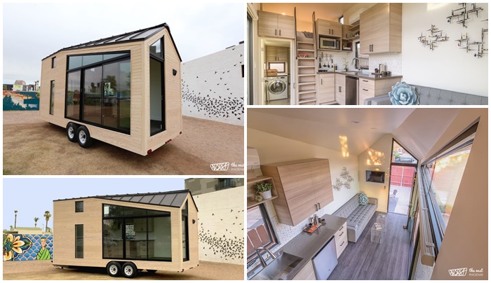 The Nest เป็นผลงานบ้านเคลื่อนที่ ได้รับการออกแบบโดย Tiny House Town ตัวบ้านหน้าจั่วประกอบขึ้นจากไม้สีอ่อนทั้งหลัง ผนังโดยรอบติดตั้งประตูกระจกบานสไลด์ตกแต่งด้วยวงกบสีดำ เพื่อเปิดให้แสงแดดจากธรรมชาติส่องผ่านเข้าไปเพิ่มความสว่างภายในได้อย่างทั่วถึง หลังคามุงเมทัลชีทน้ำหนักเบา พื้นที่อยู่อาศัยเล็กๆ เรียบง่าย แต่ก็ให้ประสบการณ์การใช้ชีวิตได้อย่างเต็มเปี่ยม