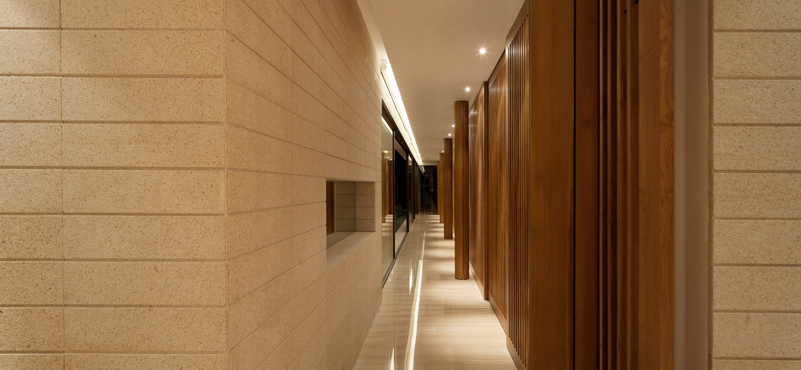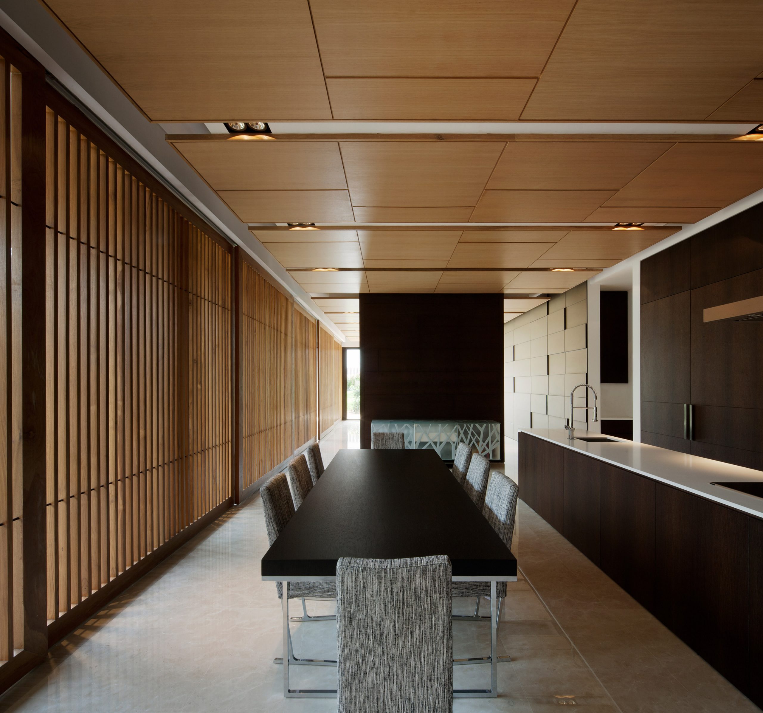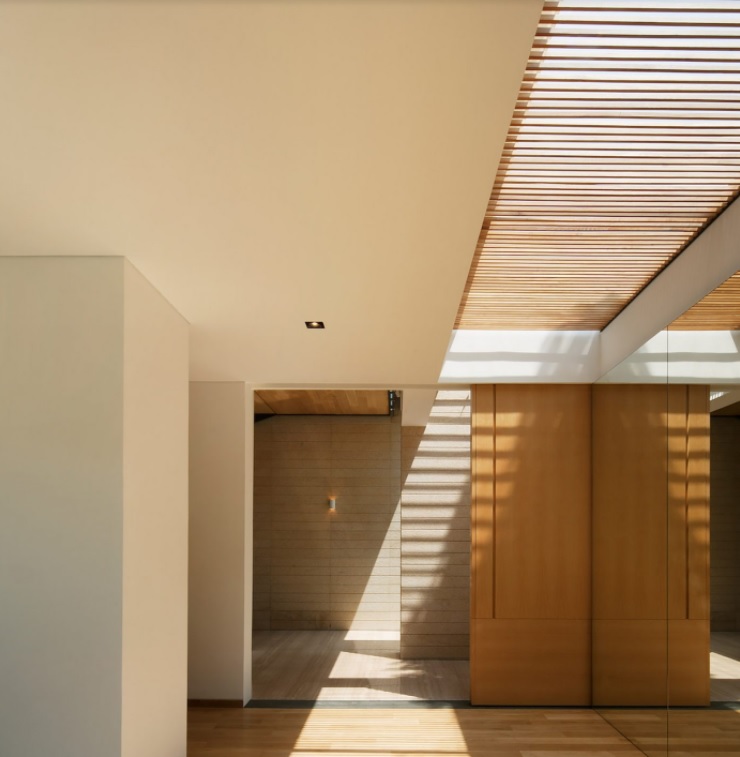 นอกจากนี้ที่บริเวณตัวบ้าน การออกแบบเพดานบริเวณนี้จะเป็นแบบระแนงไม้ ที่ตัวไม้นอกจากจะให้โทนสีและดีไซน์ที่สวยงามแล้ว ยังปล่อยให้แสงผ่านเข้ามาภายในบ้านได้อย่างพอเหมาะอีกด้วย
