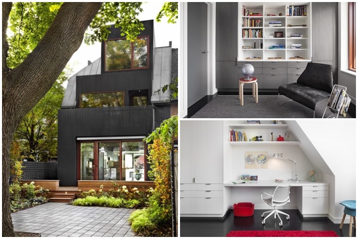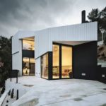 ตัวบ้านโครงสร้างคอนกรีต เห็นได้ชัดตั้งแต่มองจากภายนอก รูปทรงกล่องสี่เหลี่ยม มีลูกเล่นในการหักมุมของตัวผนังสีดำเข้ม และหลังคา ใช้วัสดุจากอลูมิเนียมคอมโพสิต และกระจก ลงตัวเป็นที่สุด กับโครงเหล็กที่ตกแต่งรอบๆบ้าน ช่องแสงที่น้อยขนาดใหญ่ ที่เน้นตามฟังก์ชันภายในบ้าน และเข้ากับสภาพอากาศที่หนาวเย็นของต่างประเทศ