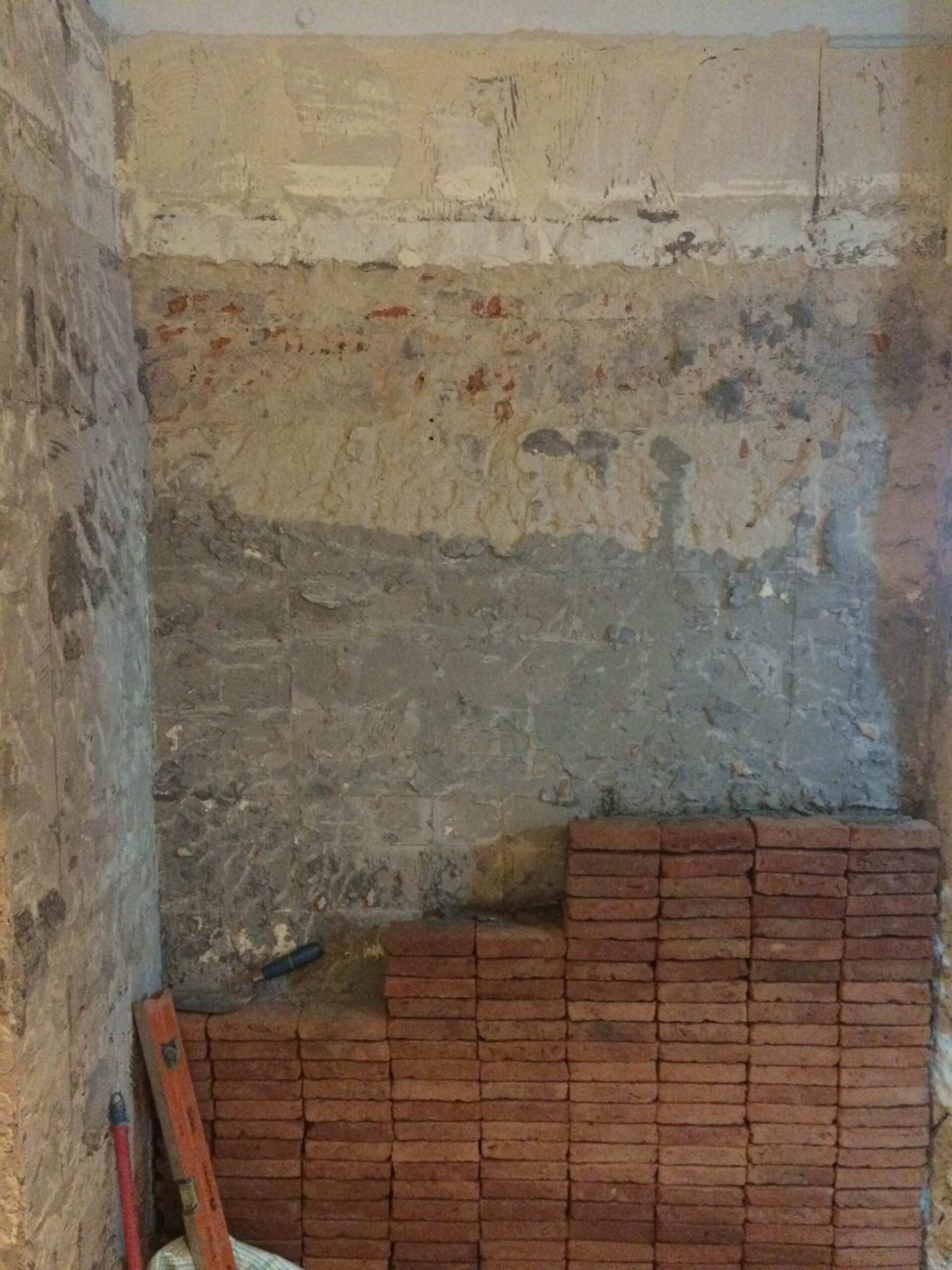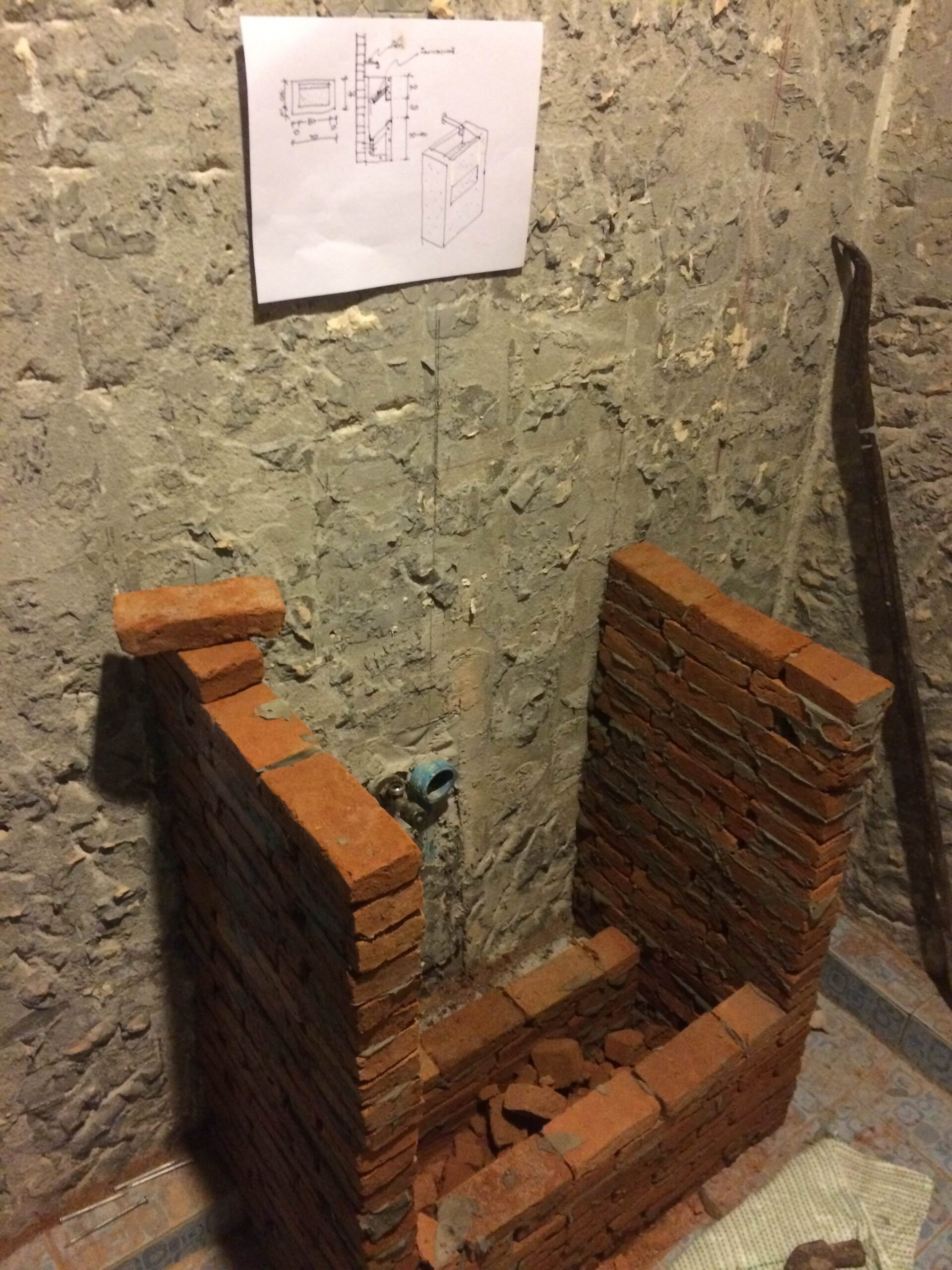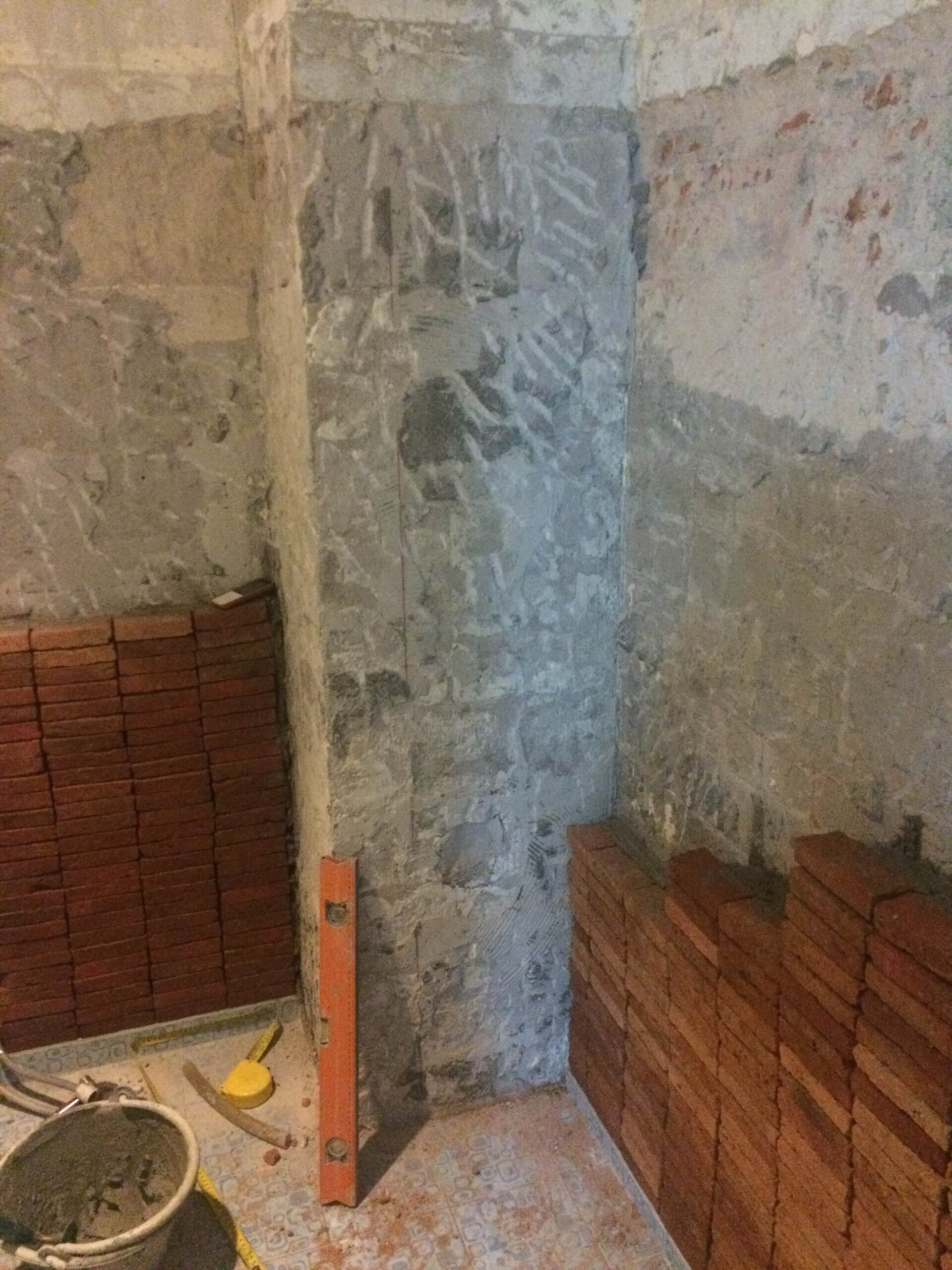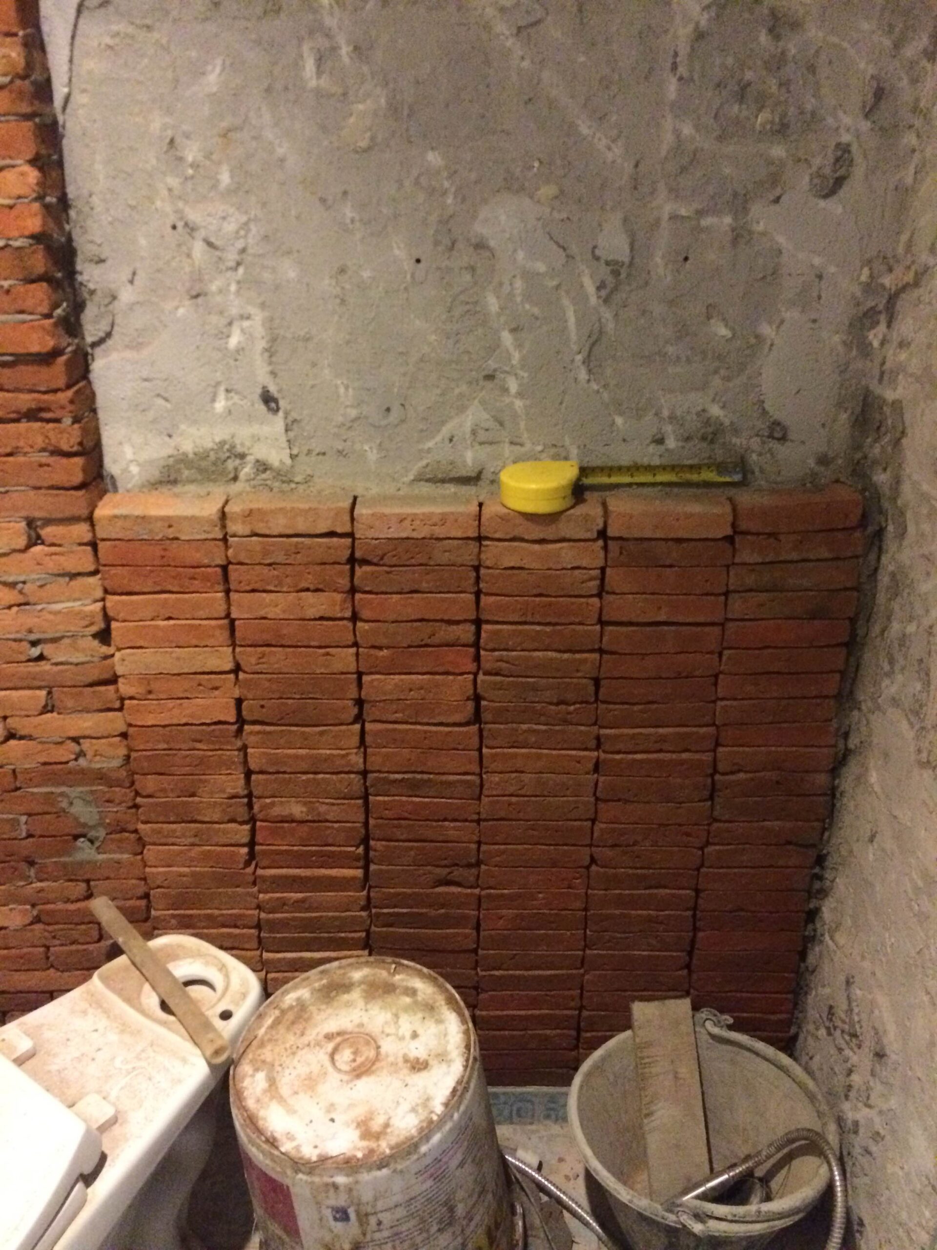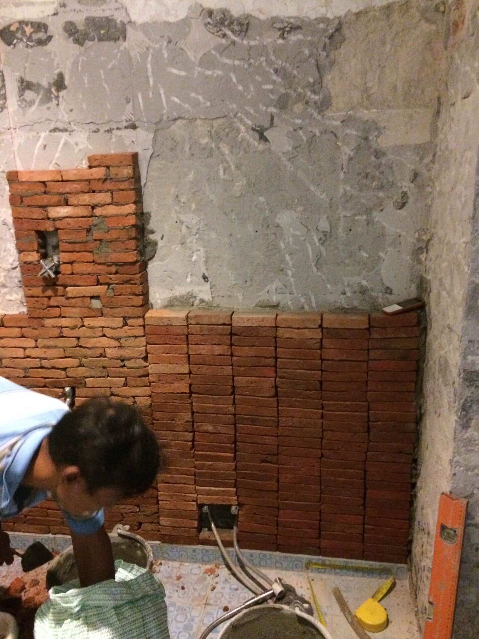 ในห้องน้ำมีผนังที่ก่อเป็นตัวซ่อนท่อน้ำจากชั้นบนลงมา อีกทั้งข้างล่างยังมีบ่าคาน ผมเลยก่ออิฐเสริมตกแต่งให้มีการเล่นระดับภายในให้เกิดความน่าสนใจเพิ่มมากยิ่งขึ้น