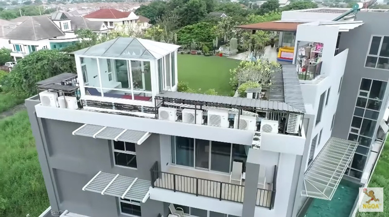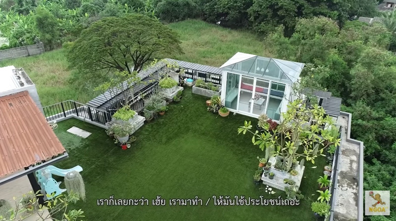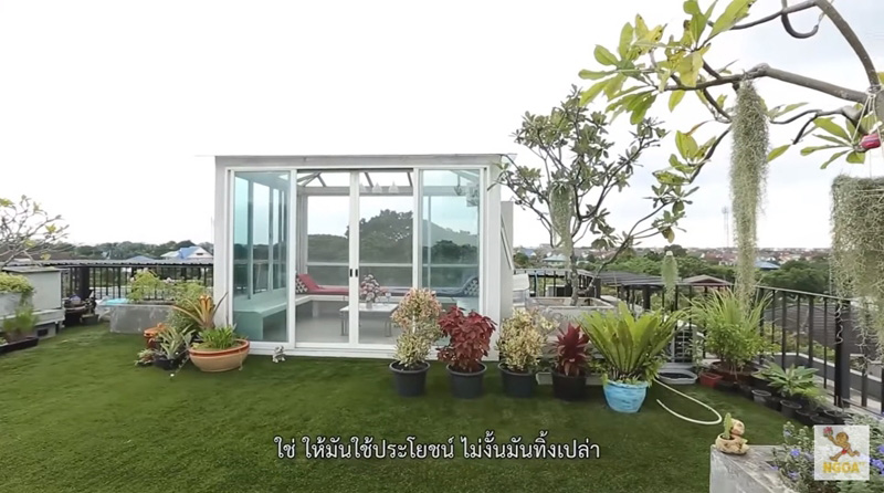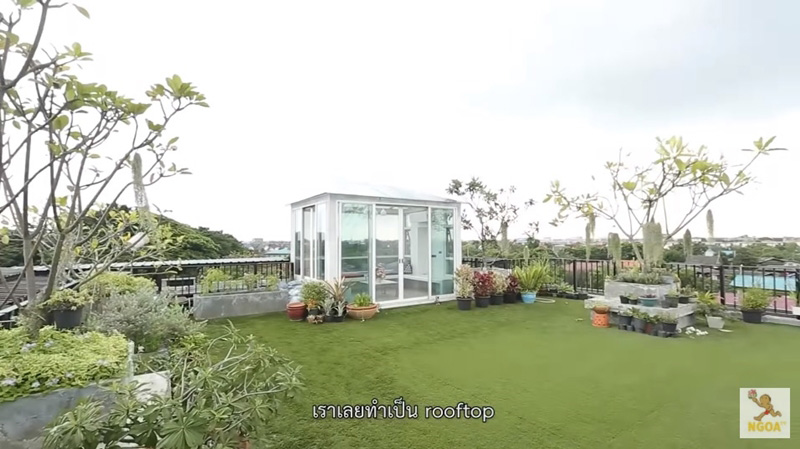 มาถึงบริเวณสุดท้ายกันแล้ว ซึ่งก็คือชั้นดาดฟ้านั่นเอง หนุ่มโต๋ได้ตกแต่งให้เป็นรูฟท็อปที่เป็นพื้นที่สีเขียว จัดเป็นสวนชั้นดาดฟ้าที่ดูสดชื่นมาก ๆ นอกจากนี้ ยังมีห้องเรือนกระจกไว้สำหรับพักผ่อนอีกด้วย