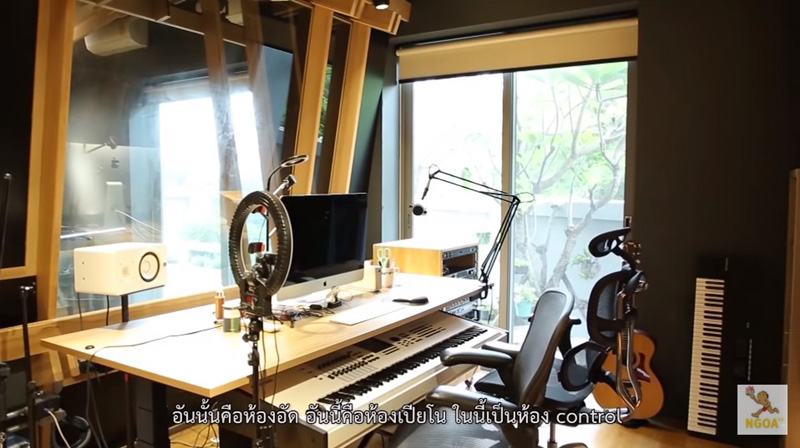 และก็มาถึงไฮไลต์ของบ้านหลังนี้ นั่นก็คือห้องอัดเสียงของหนุ่มโต๋นั่นเอง มีการออกแบบที่เน้นการใช้งานจริง จัดเต็มฟังก์ชันสำหรับการอัดเสียง มีขนาดกว้างขวาง เต็มไปด้วยเครื่องดนตรีมากมาย ซึ่งก็แบ่งห้องย่อยไปอีก มีทั้งห้องอัดเสียง ห้องคอนโทรลเสียง และห้องเปียโน