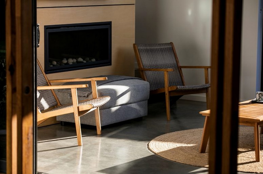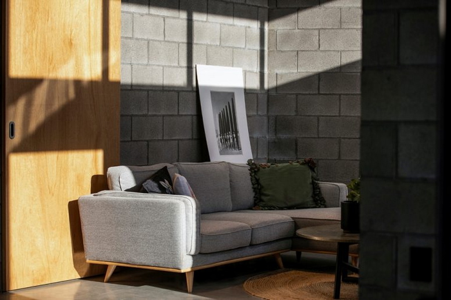 เมื่อเข้ามาภายในบ้าน เราก็จะพบกับการออกแบบพื้นที่ภายยในบ้านที่โปร่งสบาย บริเวณนี้เป็นพื้นที่ห้องนั่งเล่นที่ผสานการใช้วัสดุจากงานไม้และปูนเปลือยที่ให้บรรยากาศอบอุ่น