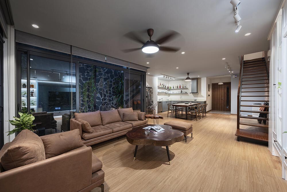 เมื่อเข้ามาภายในบ้าน เราก็จะพบว่ามีพื้นที่ด้านในที่กว้างมาก โดยเฉพาะพื้นที่ในห้องโถงหลักที่กว้างจนสามารถจัดสรรพื้นที่ใช้สอยได้หลายมุม