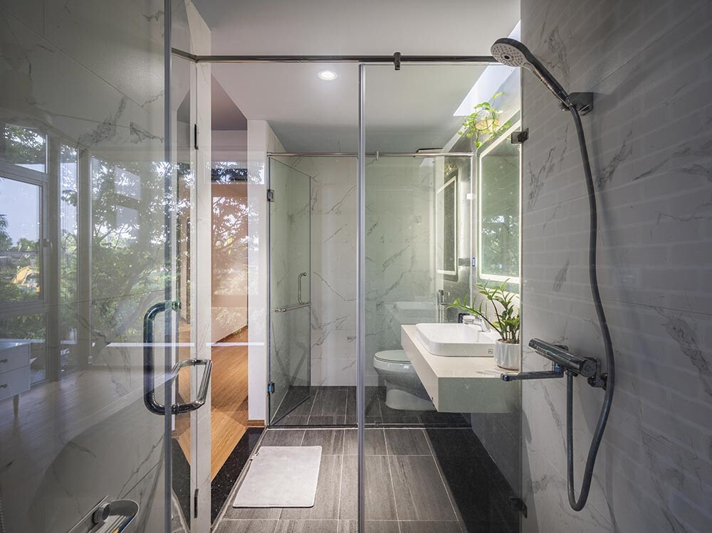 ในส่วนของห้องน้ำ เป็นอีกห้องที่มีรายละเอียดการตกแต่งแบบโมเดิร์น พร้อมกับเพิ่มความหรูหราด้วยกระเบื้องลายหินอ่อน นอกจากนี้ ยังเน้นพื้นที่รับแสงให้มาก จึงทำให้ห้องสว่างนั่นเอง