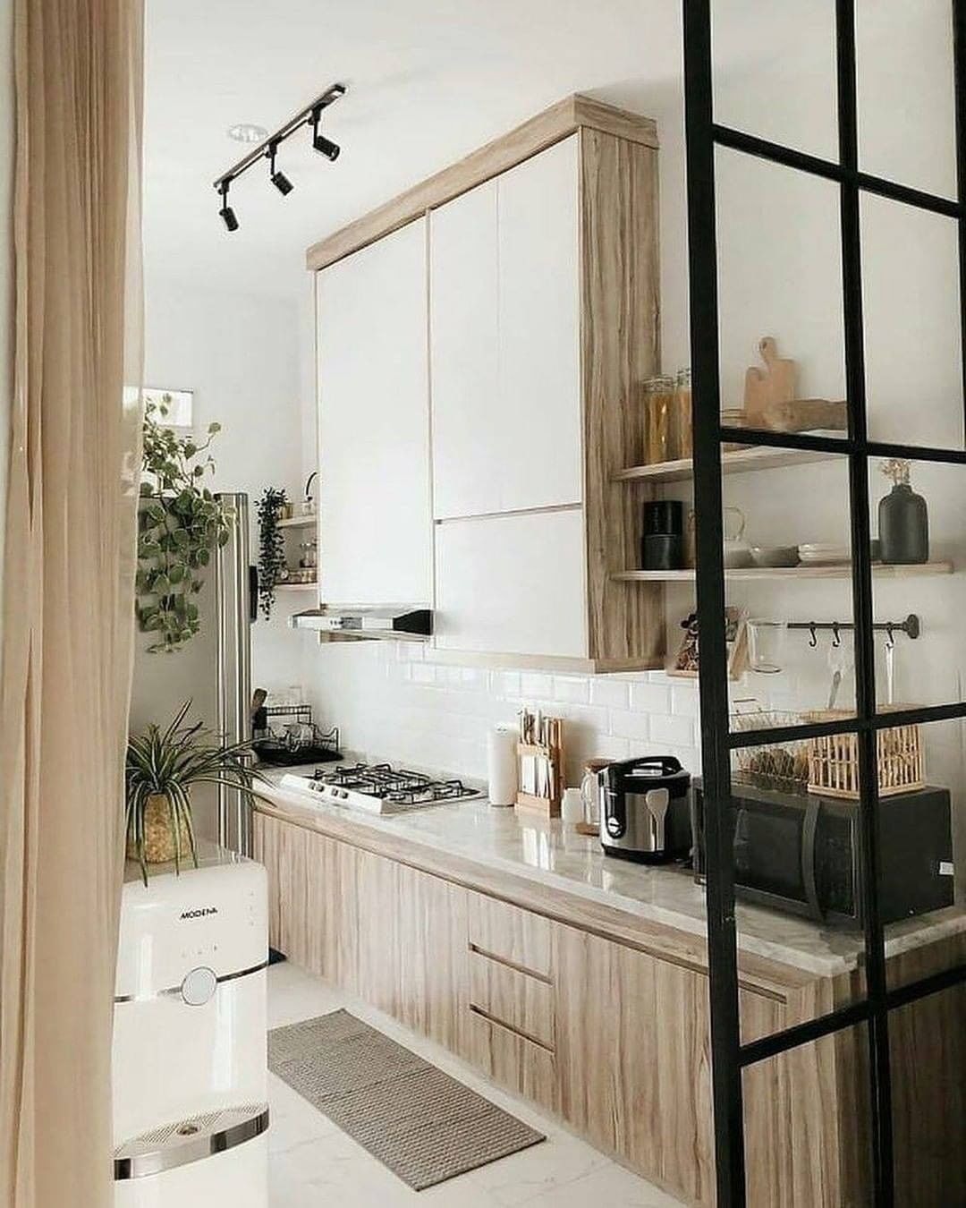ภายในห้องครัว แม้จะมีพื้นที่ไม่กว้างมากนัก แต่ด้วยการจัดสรรค์พื้นที่โดยจัดวางอุปกรณ์ต่าง ๆ เข้ามุมทุกมุมอย่างคุ้มค่า ทำให้สามารถใช้สอยห้องครัวได้อย่างสะดวกที่สุด